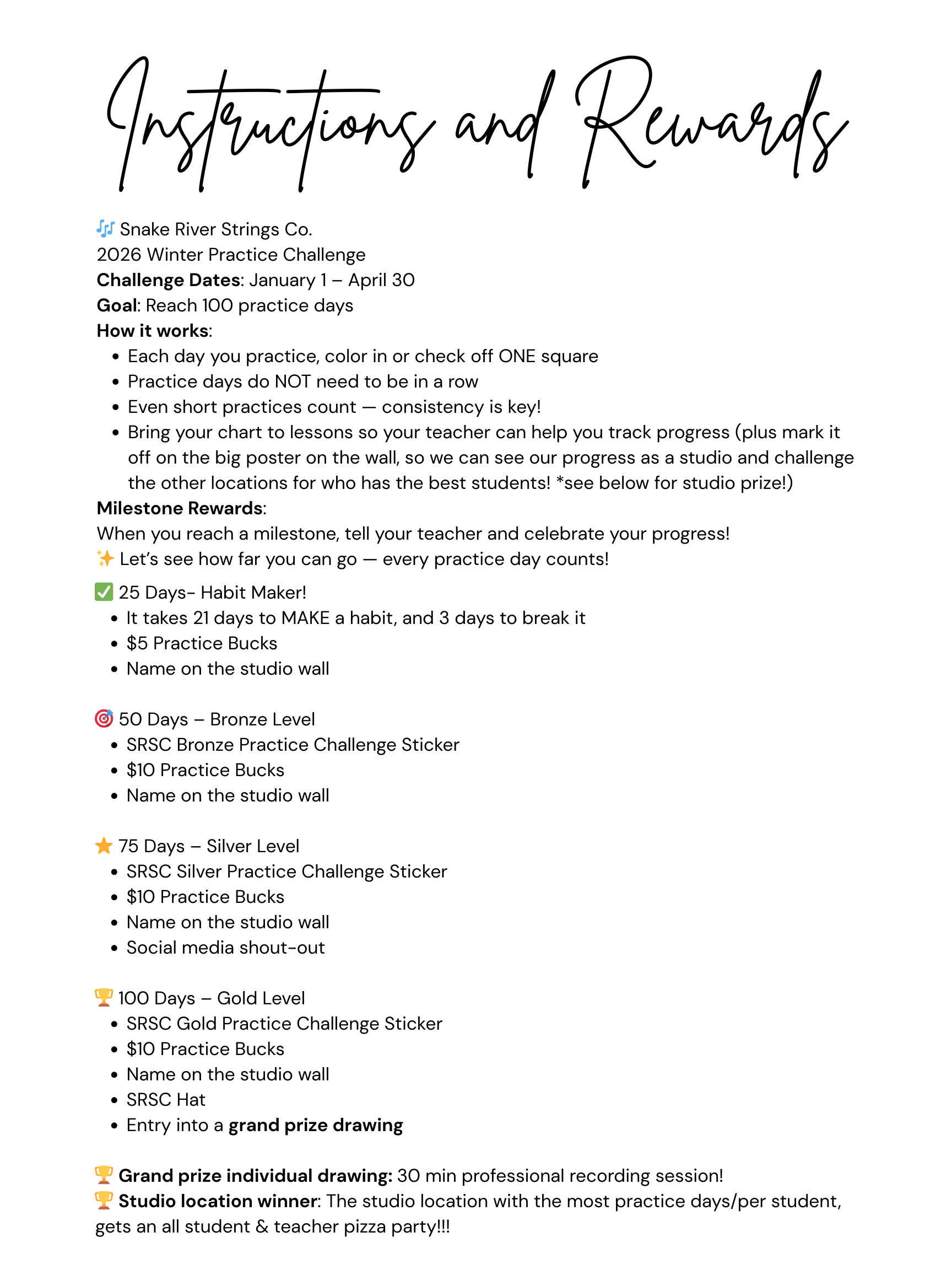 Starting January 1, we are challenging students to track practice days to build consistency and musical growth while earning rewards along the way. Find printable challenge sheets below!